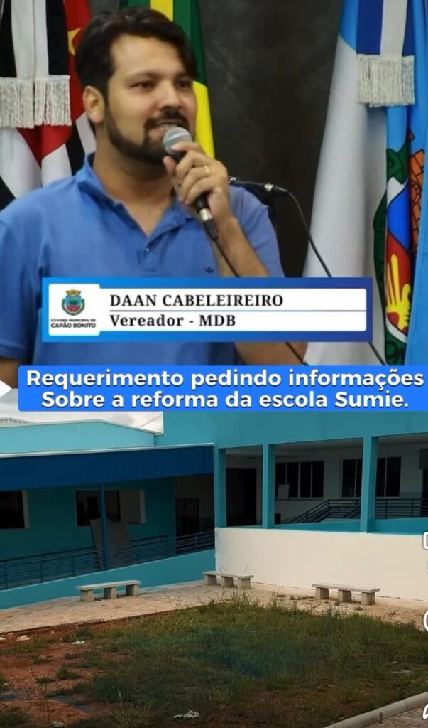 Em sessão da Câmara local, realizada no dia 02 de março, o vereador Daan Cabeleireiro, do MDB, apresentou o requerimento 12/2026 fazendo vários questionamentos referentes à obra de reforma da escola Sumie Baldissera, situada na Vila Nova Capão Bonito, que