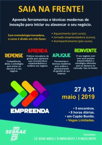 Com apoio da Prefeitura de Capão Bonito, Câmara Municipal e ACIAP, o Sebrae-SP traz pela primeira vez a Capão Bonito o curso “Empreenda”, que acontecerá entre os próximos dias 27 e 31 de maio. De acordo com o Sebrae-SP, a capacitação oferecerá aos participantes acesso a informações técnicas e ferramentas comportamentais de gestão que colocarão em cheque o posicionamento do negócio e da postura empreendedora.