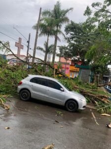 A força do vento foi tão forte em Guapiara que câmeras de segurança flagraram carros sendo movimentados pelo vento.