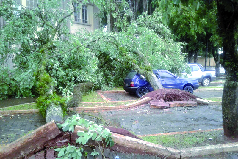 Na região da sede da Secretaria Municipal de Educação, em uma rua paralela à avenida Santos Dumont, a chuva derrubou árvores e invadiu o prédio da antiga sede da Casa da Lavoura. As árvores derrubadas pela chuva acabaram ainda caindo em cima de dois veículos.