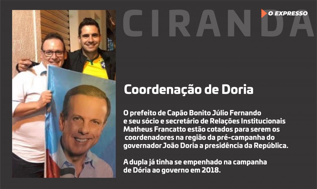 O prefeito de Capão Bonito Júlio Fernando e seu sócio e secretário de Relações Institucionais Matheus Francatto estão cotados para ser os coordenadores na região da pré-campanha do governador João Dória a presidência da República.