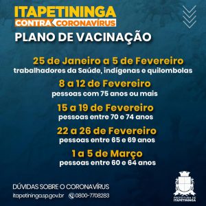 Itapetininga foi uma das primeiras cidades da região a anunciar o plano de vacinação contra a Covid-19. No próximo dia 25 de janeiro, Itapetininga inicia a imunização com os profissionais da Saúde. Do dia 8 a 12 de fevereiro, pessoas com mais de 75 anos recebem a primeira dose da vacina. A primeira etapa da vacinação vai até o dia 5 de março, priorizando as pessoas acima de 60 anos.