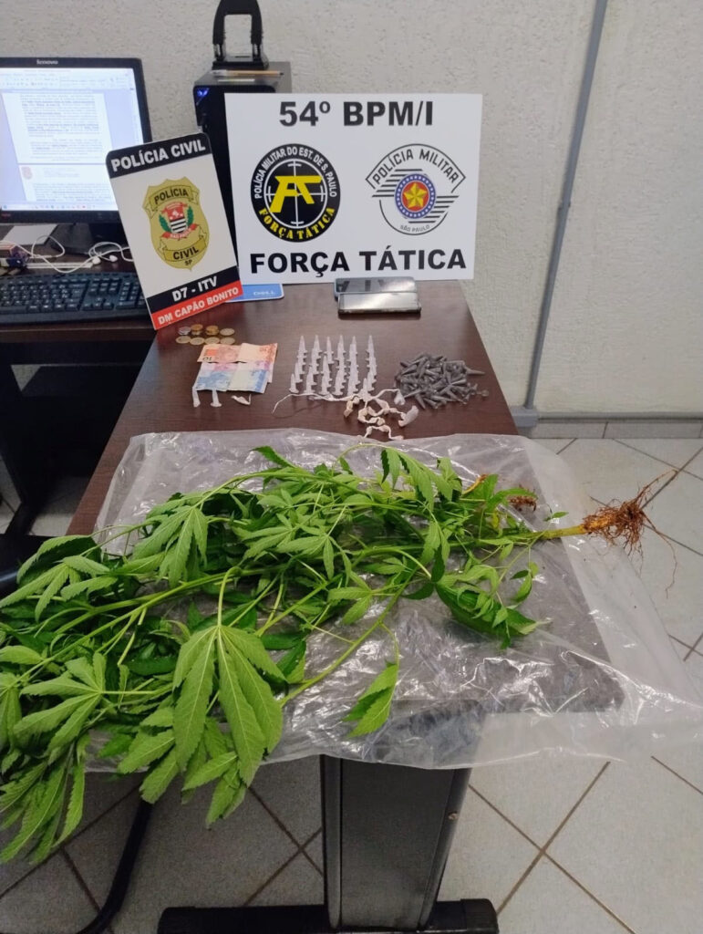 Dois homens foram presos em uma ação conjunta das Polícias Militar e Civil e da Guarda Civil Municipal na tarde de segunda-feira, dia 09, em Capão Bonito. Foram apreendidos com os indivíduos, 20 pedras de crack, 1 pedra de crack, 38 eppendorfs de cocaína, 03 pés de maconha, R$ 24,00 em dinheiro, 02 eppendorfs de cocaína e 02 telefones celulares.