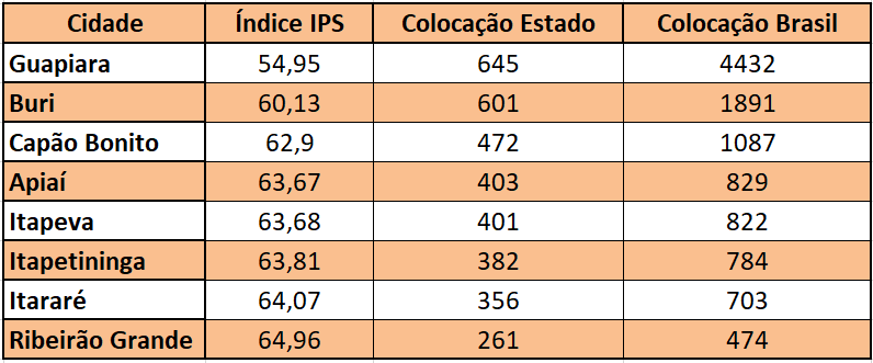 Além dos números de Guapiara, O Expresso analisou os dados de outras cidades, como Buri, Capão Bonito e Ribeirão Grande. No caso de Buri, a pontuação atingida foi 60,13, o que proporciona a colocação 601 dentro de São Paulo e 1.891 no Brasil, já Capão Bonito o índice atingido foi 62,90, o que coloca a cidade na posição 472 no Estado e 1.087 no Brasil, já o município de Ribeirão Grande tem o melhor resultado entre os avaliados, atingindo o índice de 64,96, ficando na posição 261 no Estado e 474 no país. Para efeitos de comparações, a média atingida pelos municípios de São Paulo é 66,20 e no Brasil esta média é de 61,80.