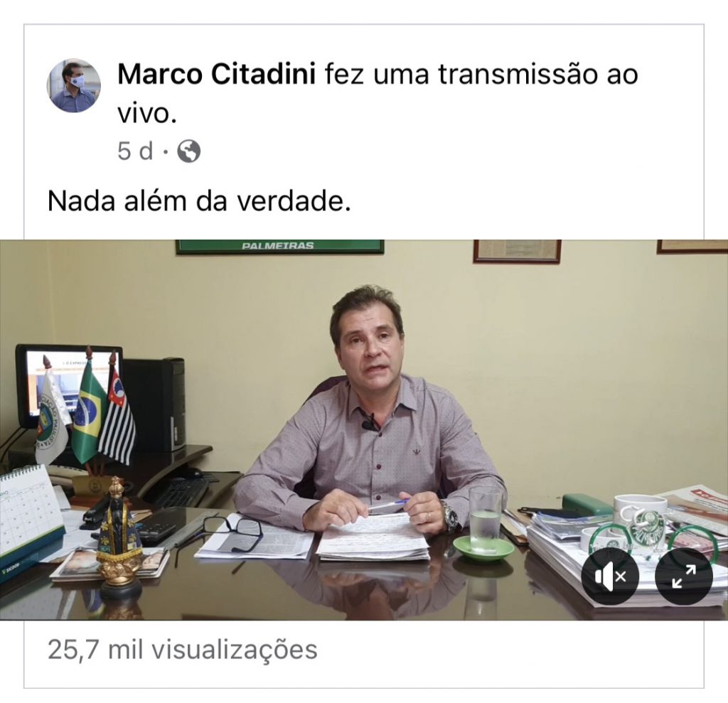 O ex-prefeito Marco Citadini promoveu uma Live em sua página no Facebook na última sexta-feira, dia 11, com o tema: “Nada além da verdade…”. Na ocasião, o político rebateu os ataques que vem recebendo da atual gestão municipal, comandada pelo prefeito Julio Fernando, e também falou da má condução da Prefeitura no enfrentamento à Covid-19.