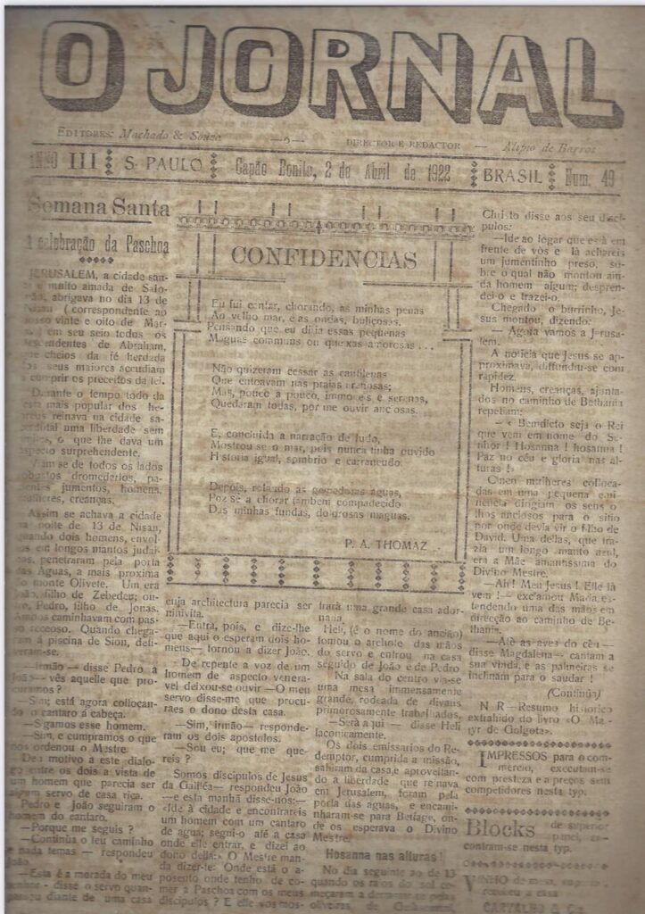 Diferentemente do que se imaginaria, não há nada sobre o aniversário de emancipação administrativa do município, a matéria de destaque desta edição de O Jornal é sobre a celebração da Páscoa. Há também um poema intitulado Confidências, de autoria de P.A. Thomaz, ambos na primeira página.