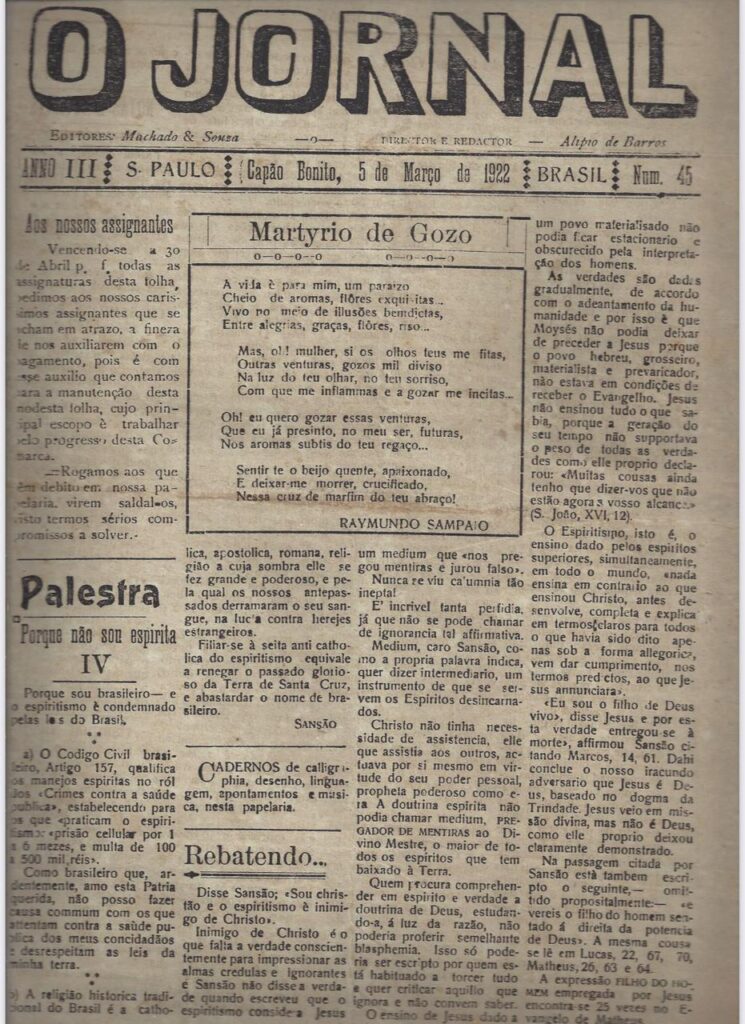 Nesta edição há um espaço de duas páginas para uma discussão sobre ser ou não ser espírita, há mais de 100 anos, onde os dois lados colocavam suas versões. Há também um poema denominado o Martyrio de Gozo, de autoria de Raymundo Sampaio.