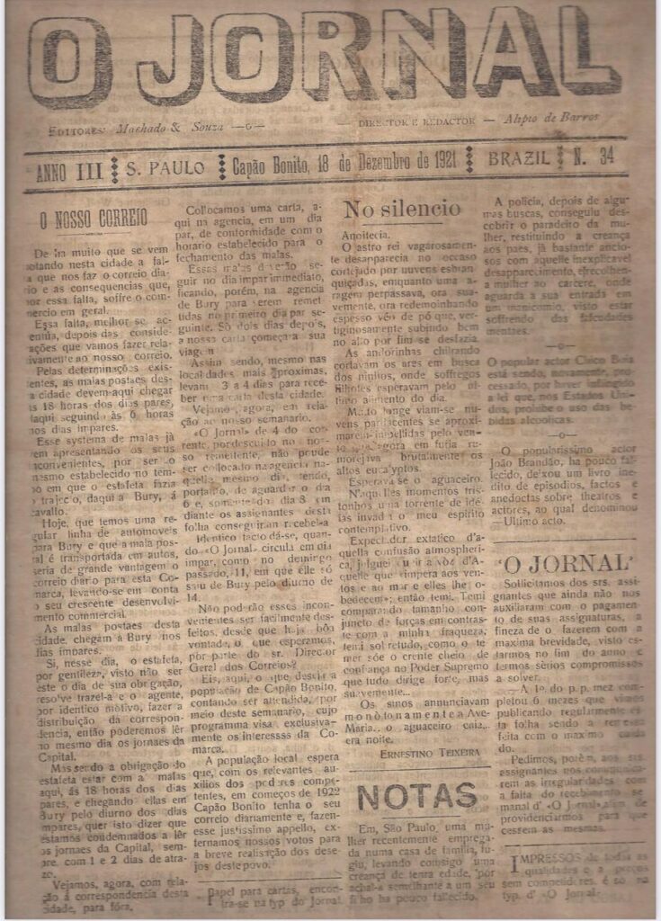 A coluna O Expresso na História dessa semana vai disponibilizar no site deste semanário a edição completa e totalmente digitalizada de O Jornal que circulou em Capão Bonito em 18 de dezembro de 1921.