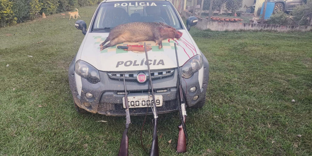 Durante um patrulhamento ambiental com vistas à caça ilegal de animais silvestres, na última quarta-feira, dia 25, pela área rural do bairro Capoavinha, em São Miguel Arcanjo, a equipe da Polícia Militar Ambiental, ouviu disparos de arma de fogo próximo a uma área de mata. De imediato, posicionaram a viatura na vegetação para camuflá-la. Após um período, ouviram mais disparos e avistaram 3 indivíduos saindo do local. Ao realizar a abordagem, conseguiram deter uma pessoa portando uma bolsa com duas espingardas calibre 32, os outros fugiram sentido a mata, deixando para trás uma espingarda calibre 24 e um animal abatido (cateto – porco do mato).