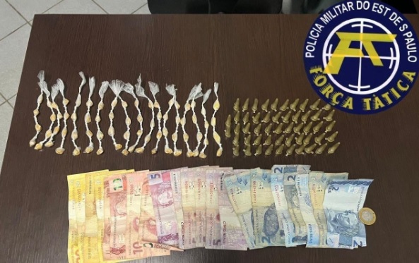 De acordo com a polícia, durante a revista pessoal foram apreendidos R$ 166 em dinheiro, 52 porções de cocaína e 72 porções de crack.