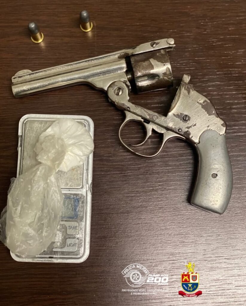 Ao todo, foram apreendidos 1 revólver calibre .38, 2 munições calibre .38, 1 balança de precisão, 50 eppendorfs vazios, 10g de cocaína, 01 celular e R$ 31,00 em moedas.