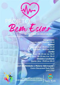 A Secretaria Municipal de Educação, Cultura, Esporte e Turismo com apoio da Secretaria de Assistência Social está retomando o Projeto Bem-Estar da Educação, no Centro Educacional, Cultural e Esportivo “Paulo Freire”.