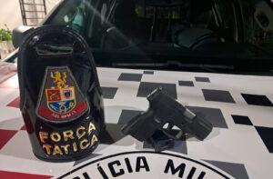 Com um ponto de bloqueio na Avenida Lucas Nogueira Garcez, os policiais fizeram as apreensões de 5 unidades de cocaína, 30 de crack e 1 pistola Taurus G2C cal. 9mm, contendo 13 munições.