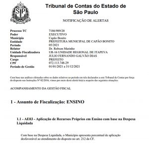 Segundo o Tribunal de Contas do Estado de São Paulo, a Prefeitura de Capão Bonito vem apresentando desde o início deste ano, falhas na condução da gestão financeira da Educação.