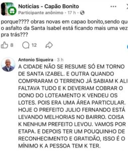Os moradores pediam pavimentação das ruas do bairro em páginas de notícias quando o vereador entrou na publicação e respondeu que a cidade não se resume ao bairro Santa Isabel e que os moradores quando compraram terreno no loteamento sabiam que estavam sem infraestrutura e que faltava tudo. O vereador ainda disse que os moradores deveriam cobram dos donos do loteamento a falta de pavimentação e que a população deveria ter gratidão ao prefeito.